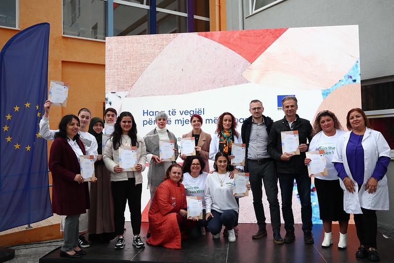 12 shkollat e përfshira në konkursin për mbledhjen e plastikës morën certifikata pjesëmarrëse nga zyra e BE-së Shqipëri për veprimet e tyre në mbrojtje të mjedisit, ku u panë me kërshëri edhe instalacionet artistike të shkollave “Vinçenc Prendushi”, “Bajram Curri”, “Jusuf Puka”, “Kushtrimi i Lirisë” etj., ku të pranishëm në aktivitet ishin edhe përfaqësues nga shtetet anëtare të BE-së.