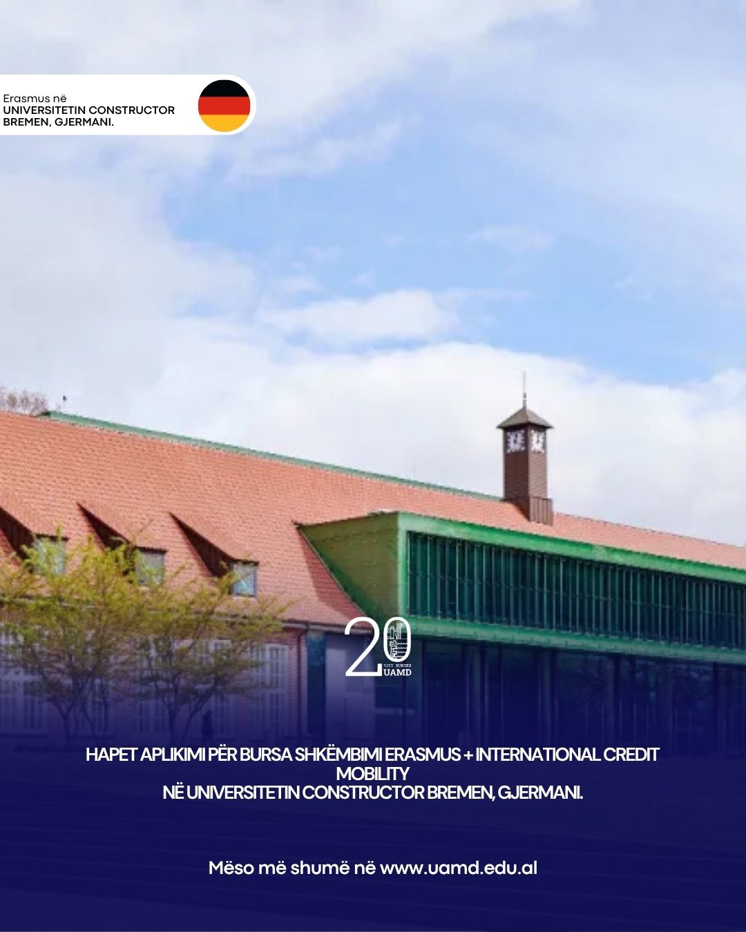 Universiteti “Aleksandër Moisiu” Durrës, në kuadër të programit Erasmus+ KA1, ju ofron studentëve bursë të plotë për të zhvilluar semestrin e dytë të vitit akademik 2025 – 2026, në Universitetin Constructor Bremen, Gjermani (Master’s degrees | Constructor University ).