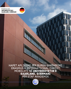 Within the framework of the Erasmus+ program, the International Credit Mobility component, signed between Saarland University in Germany ( https://www.uni-saarland.de/ ) and the "Aleksandër Moisiu" University of Durrës for the period 2023-2026, a call for applications from academic staff is open for: