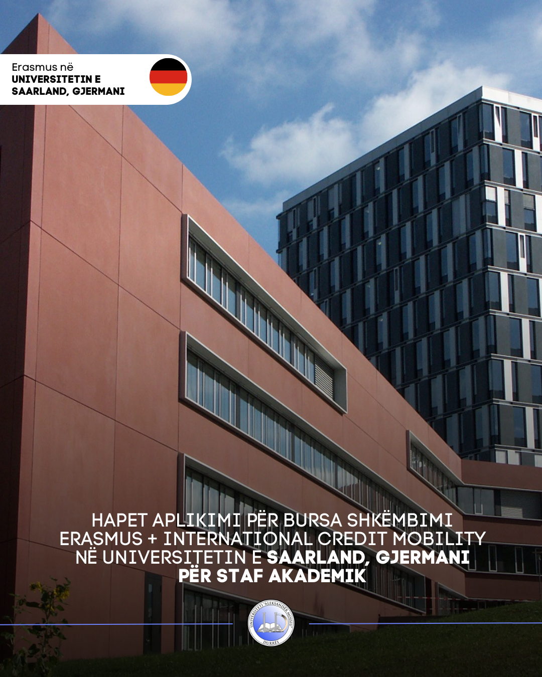 Within the framework of the Erasmus+ program, the International Credit Mobility component, signed between Saarland University in Germany ( https://www.uni-saarland.de/ ) and the "Aleksandër Moisiu" University of Durrës for the period 2023-2026, a call for applications from academic staff is open for: