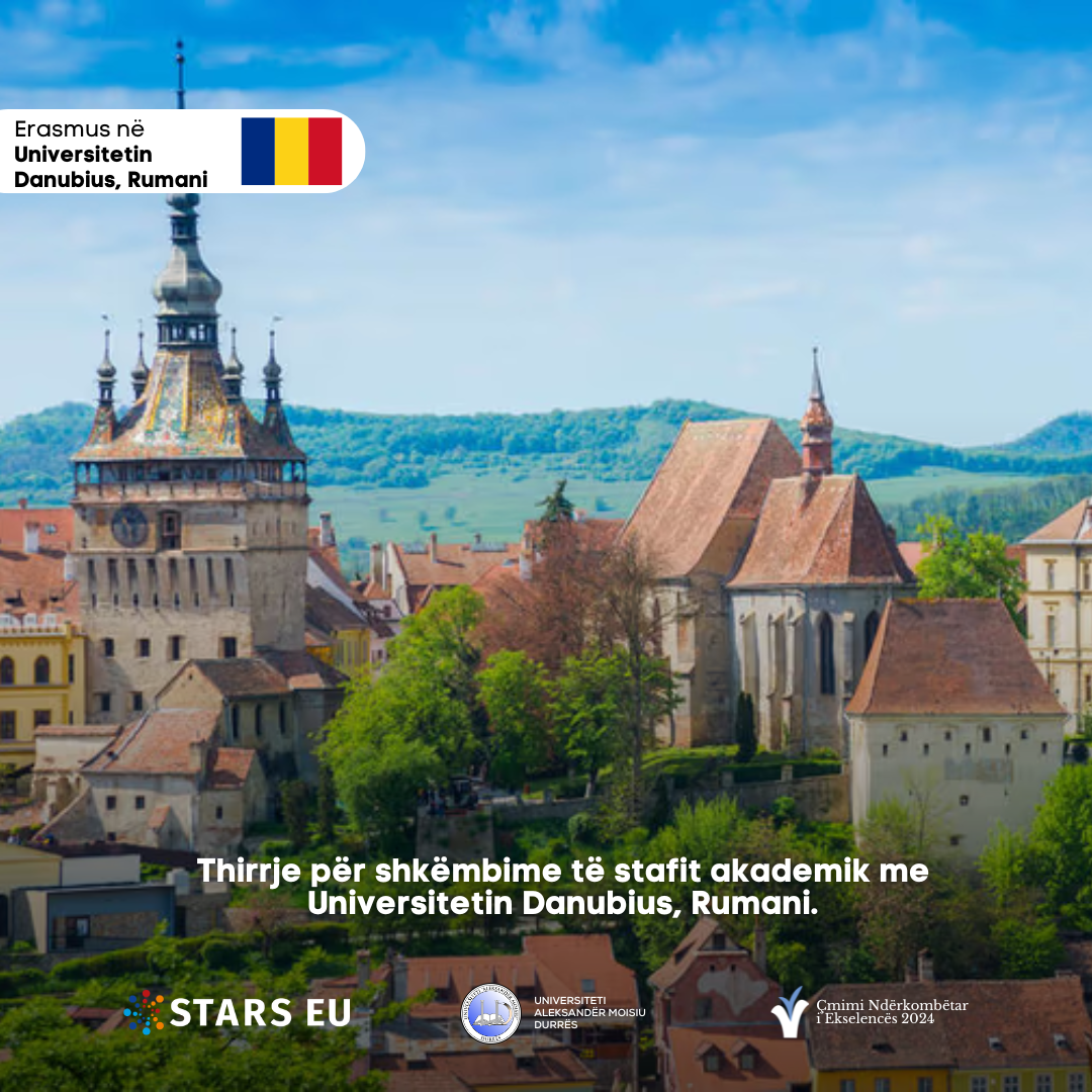 Universiteti “Aleksandër Moisiu” Durrës, në kuadër të programit Erasmus+ KA171, i ofron stafit akademik mundësinë për të zhvilluar një javë mësimdhënie/trajnim në Universitetin Danubius, Rumani. (https://univ-