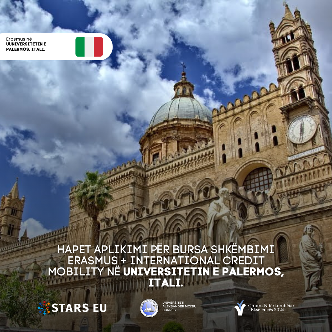 Universiteti “Aleksandër Moisiu” Durrës, në kuadër të programit Erasmus+ KA1, ju ofron studentëve bursë të plotë për të zhvilluar semestrin e parë të vitit akademik 2026 – 2027, në Universitetin e Palermos, Itali. https://www.unipa.it/