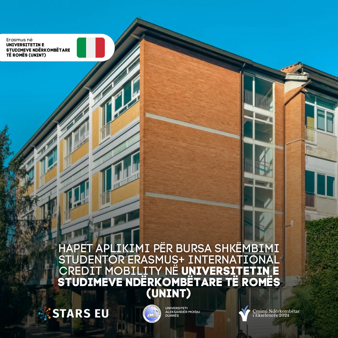 Universiteti “Aleksandër Moisiu” Durrës, në kuadër të projektit COMMO IX si dhe programit Erasmus+ KA171, u ofron studentëve mundësinë për të përfituar bursë të plotë për të zhvilluar një periudhë studimi në UNINT Roma, Itali. https://